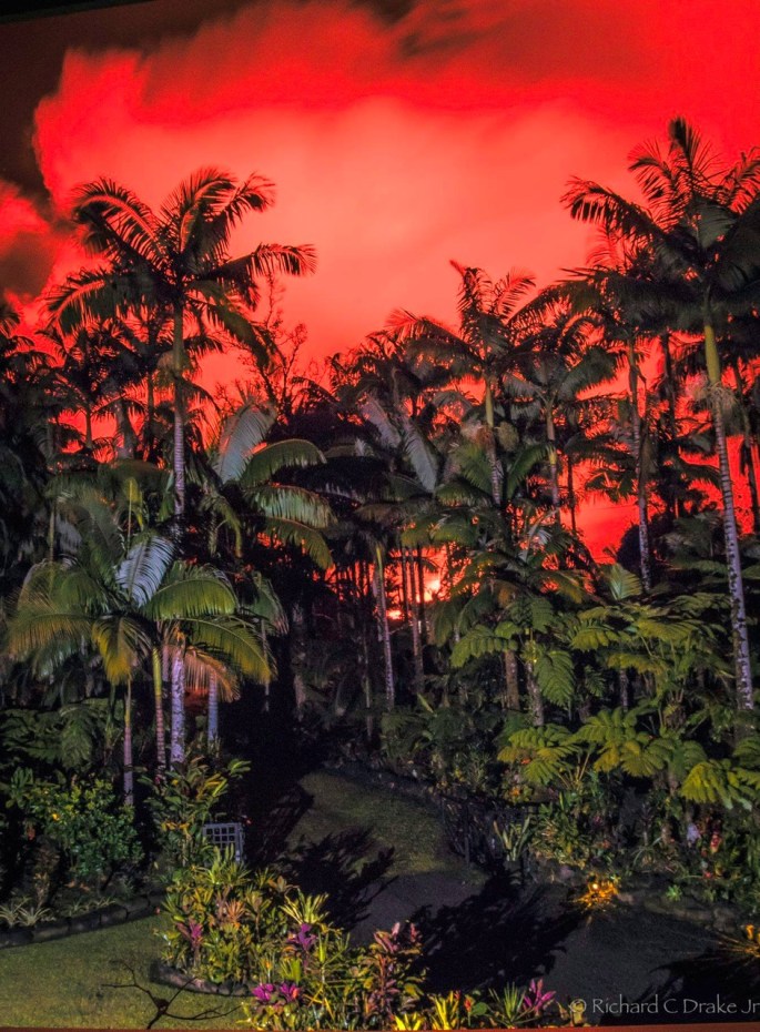 This photo was taken from the upper deck of our neighbor’s house. This was in the middle of the night, and the bright yellow glow you see in the middle is fire from the lava.