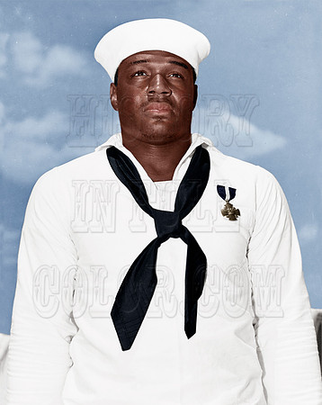 When the Japanese attacked Pearl Harbor, Miller was below deck doing laundry. As the alarm sounded and the crew was called to battle stations, Miller made his way to a gun magazine amidships. After a torpedo struck and damaged the magazine, Miller began to carry the wounded to safety. Among those he assisted was the ship’s commander, Capt. Mervyn Bennion, who was critically injured. Miller then took over a .50-caliber antiaircraft gun and continued to fire at the enemy until he exhausted the ammunition and received orders to abandon ship.